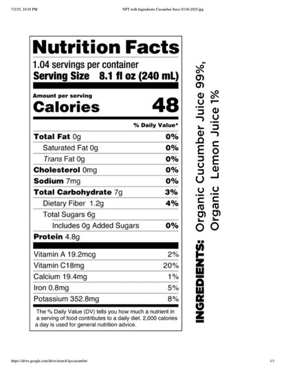 Looking for the health benefits of CUCUMBER without the hassle of the actual vegetable ? Our Organic Cucumber Juice is made only with 100% Pure Organic Cucumber. Tastes great on its own, with club soda, sparkling water or mixed in smoothies and other drinks.